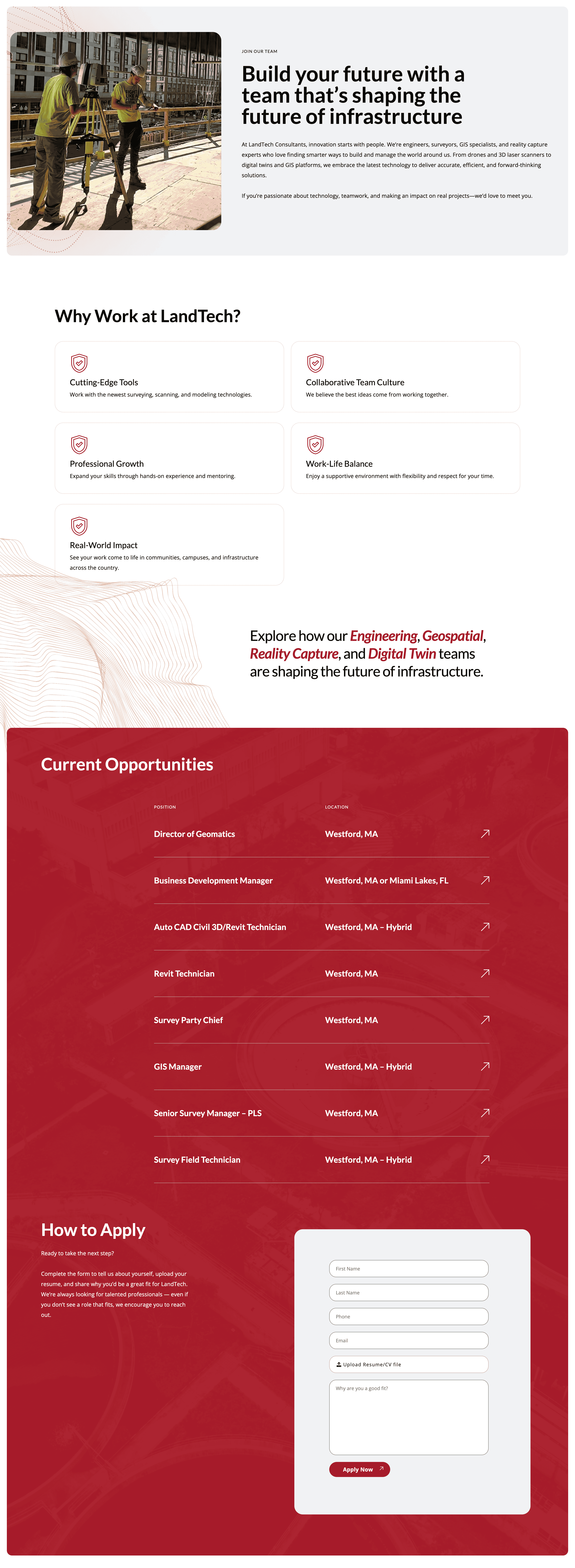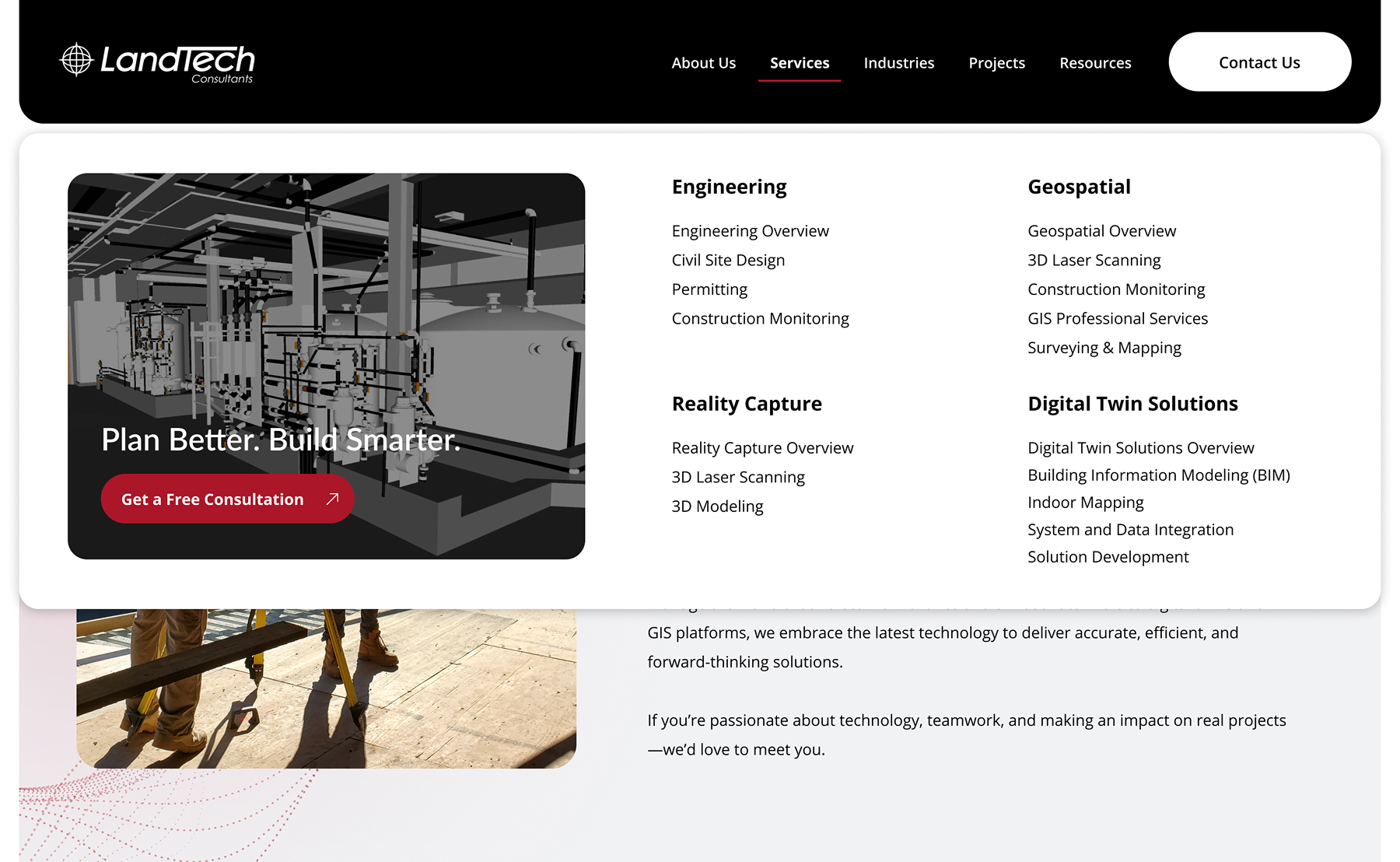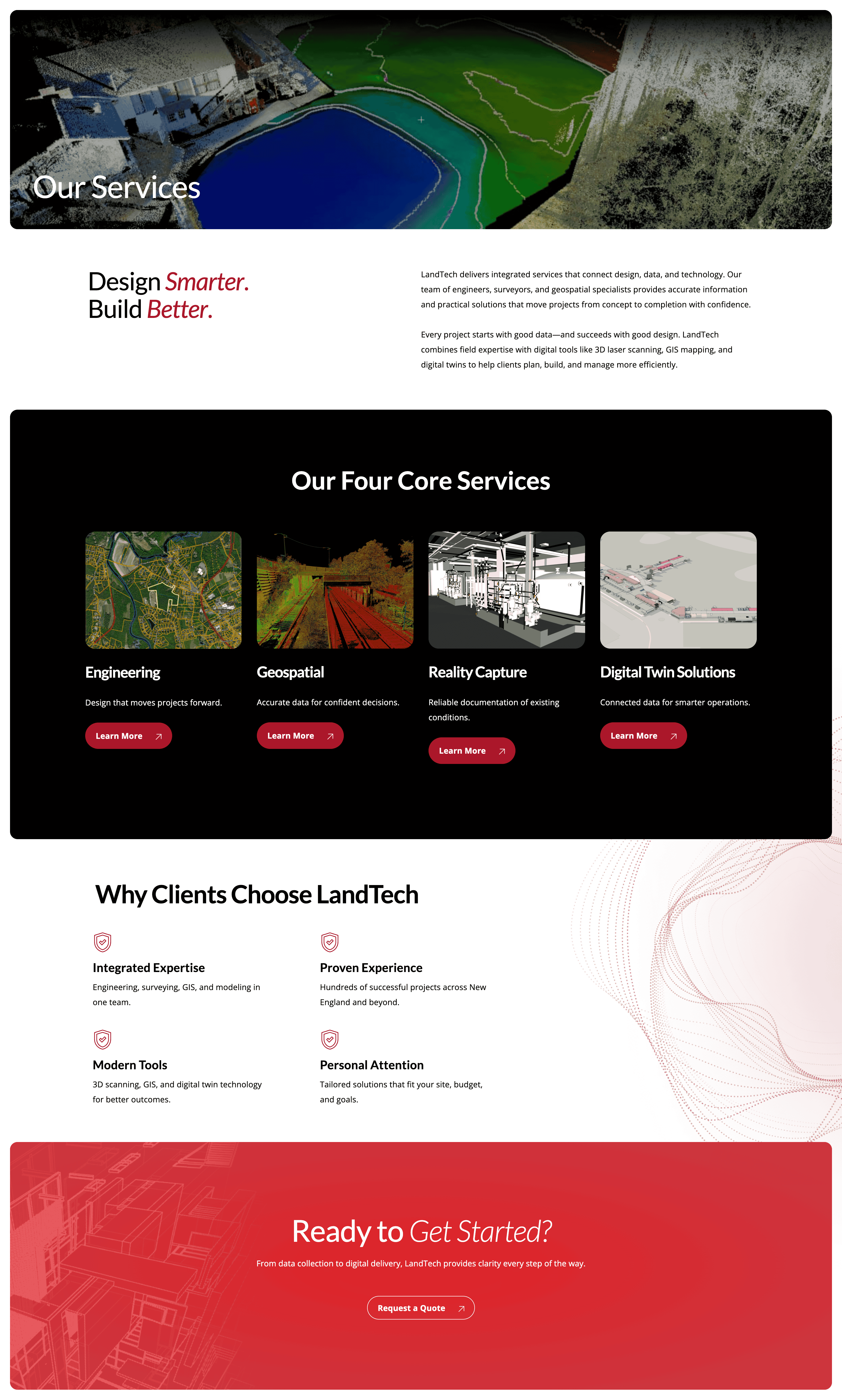LandTech Consultants is a leading engineering, surveying, and digital twin solutions. With a growing portfolio spanning commercial, institutional, industrial, and infrastructure projects, LandTech needed a digital platform that organized a complex service offering into an intuitive experience and positioned them as a forward-thinking partner for modern infrastructure challenges.